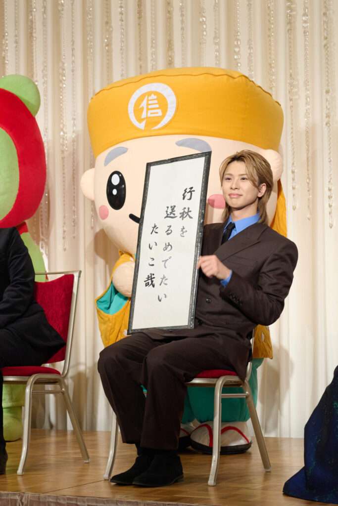 2026年に200回忌を迎える小林一茶。本作にも登場する彼の生まれ故郷である長野県・信濃町からはそれぞれのPR キャラクターであるアルクマと一茶さんが特別ゲストとして登場し、一茶さんの手には「行秋を 送るめでたい たいこ哉」という俳句が。これは小林一茶の晩年の日記に記された句で、季節が秋から冬へと移り変わる頃、部屋のあちこちに祭りの太鼓の音が響き、行く秋を送る太鼓だと感じて詠んだ句です。秋を送り出す太鼓のように、舞台をめでたく響かせたいという思いで持ってきてくれたとのこと。アルクマと一茶さんの登場で、会見は一気に和やかな雰囲気に包まれました。
