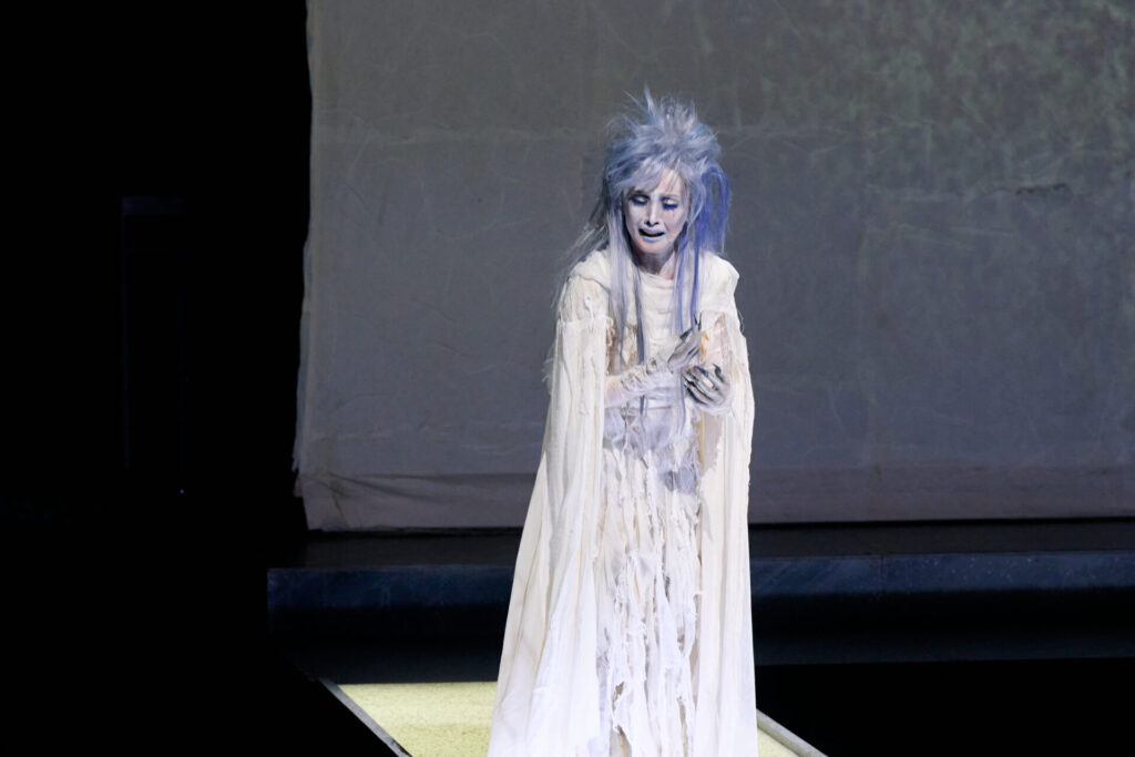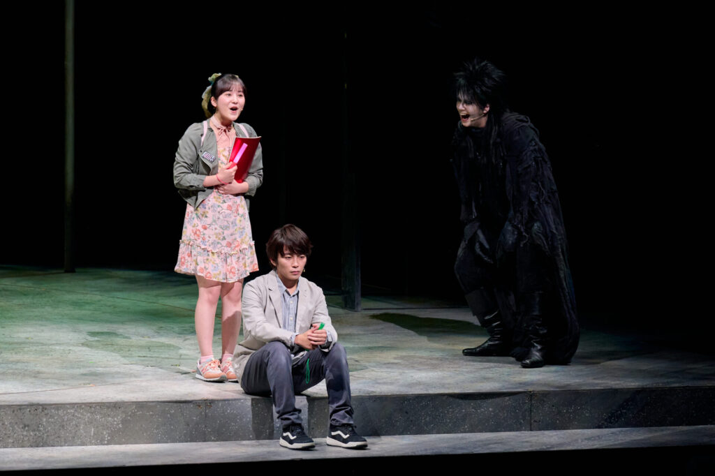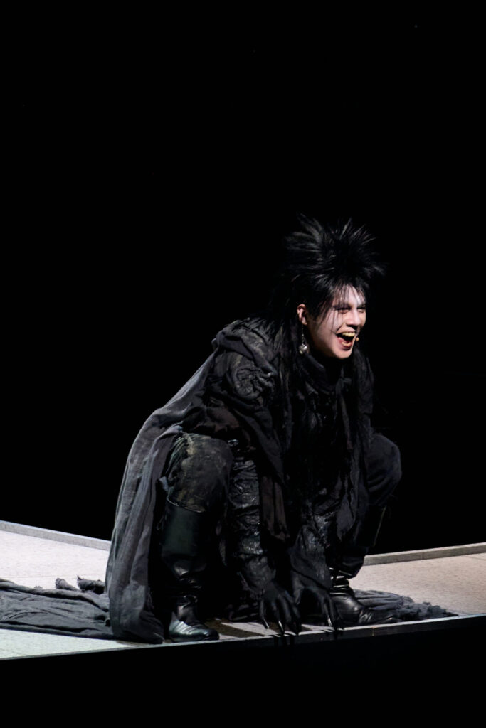 浦井健治さん演じる死神リュークと濱田めぐみさん演じる死神レムは、銀橋のような客席に近い通路舞台から、まるで人間界の我々を眺めるかのように登場。