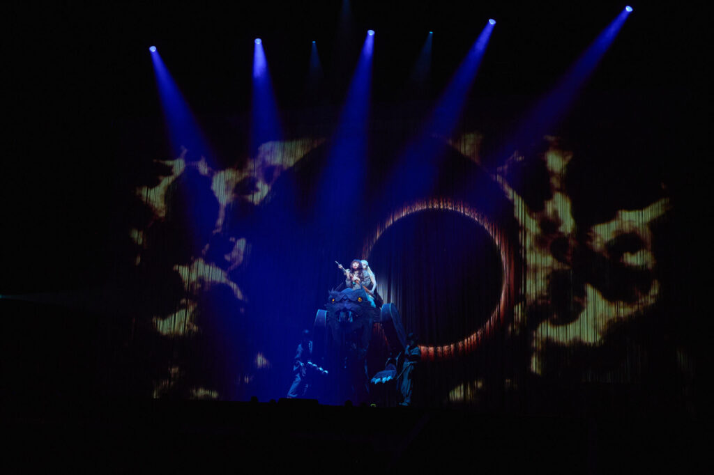 ヨウコを襲う妖魔(ようま)、十二国に住む異形の獣たちは、パペットを用いて人力で表現し、柚香さん、加藤さんは舞台上を駆け回って妖魔と対峙します。