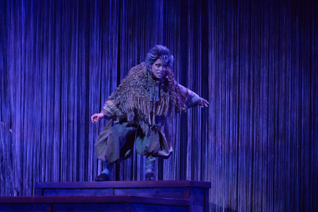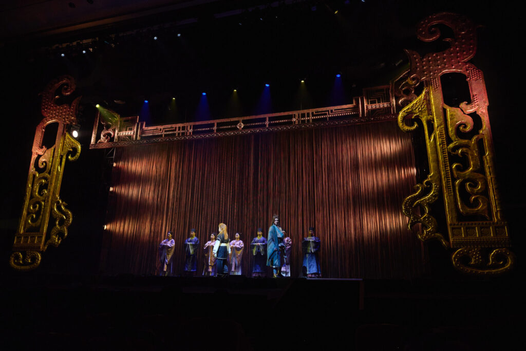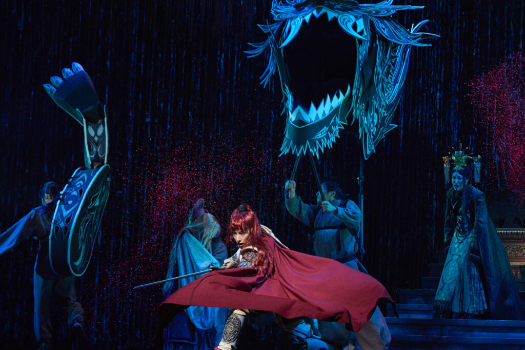 舞台セットは、製作発表でもキーワードとして出てきた「モップ」と呼ばれるストリングカーテンの装置が印象的に使用されます。「虚海(きょかい)」と呼ばれる広大な海を渡り、十二国のある異世界へと誘われるシーンでは、モップが大きく回転。映像を映し出すスクリーンとしても機能します。