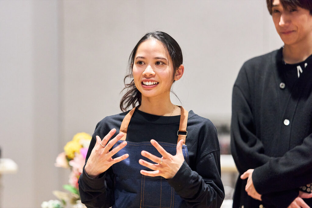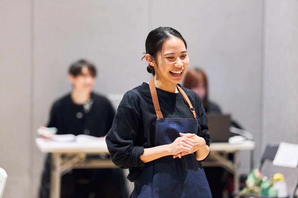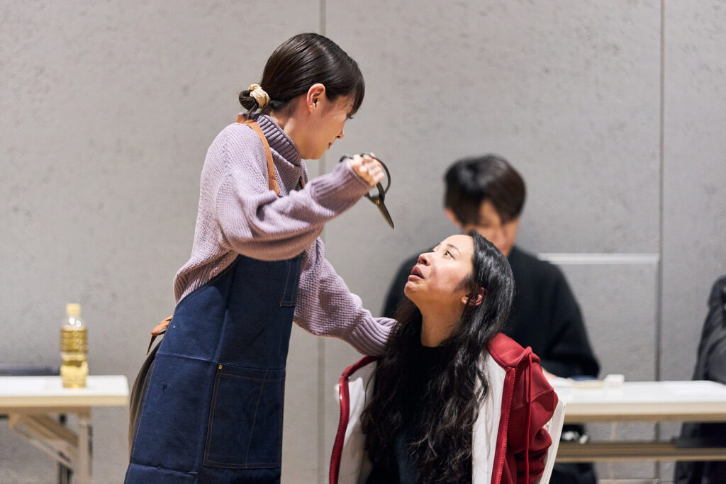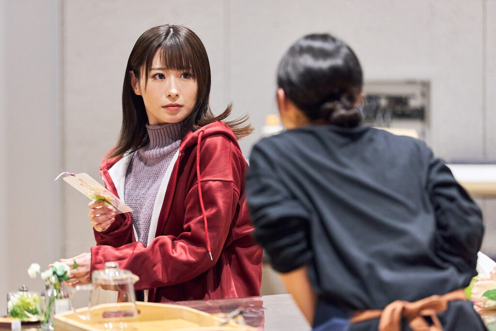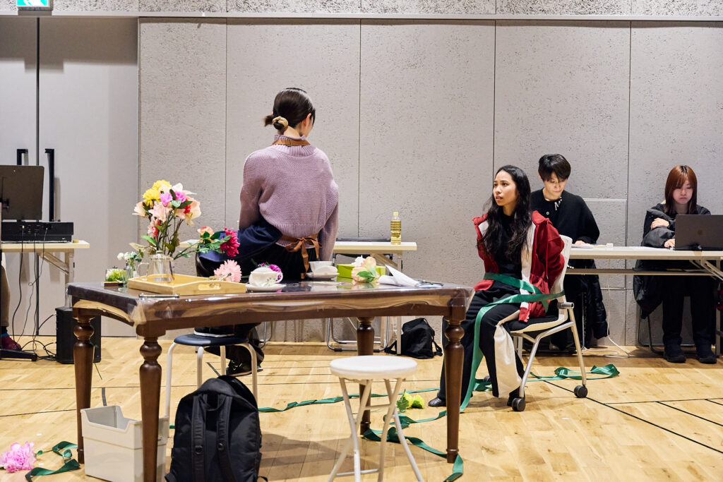 花屋で働く白椿 蒼(屋比久知奈さん)の元に、母を殺し、6年の刑期を終えた双子の姉・白椿 紅(唯月ふうかさん)が訪れます。稽古場シーン披露ではまず、花屋で働くことになった経緯を蒼が語る「ホトトギス」と、紅が前科者としてレッテルを貼られながら生きていることを告白する「雑草」が披露されました。(第二場・再会)
