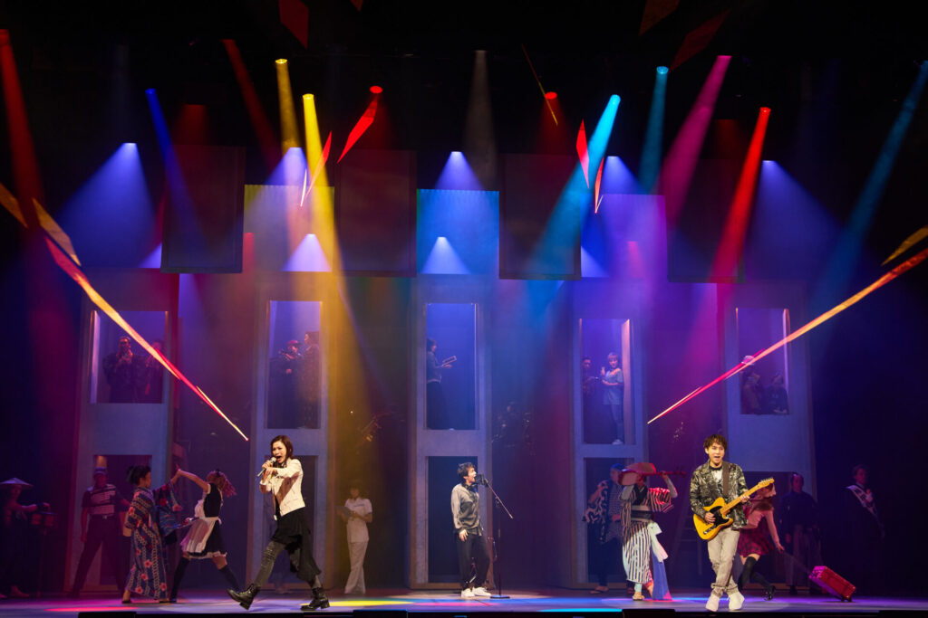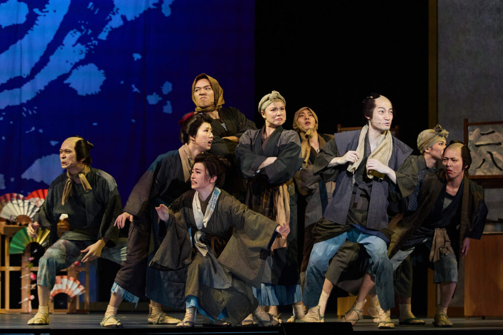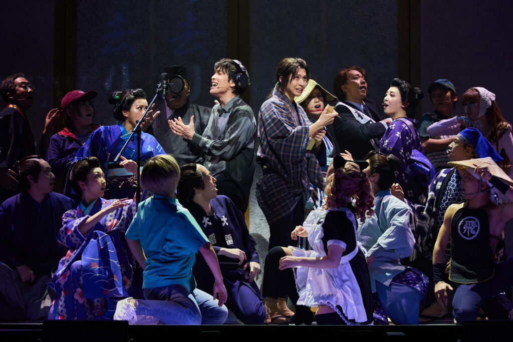 舞台上に広がるのは、小林一茶の俳句が書かれた短冊の数々。これが時代を超える扉となって、現代の人々と江戸時代の人々が入り混じり、海人のヒットソング「TALK TALK TOKYO」が歌われていきます。リズミカルで現代的なナンバーに、新たなミュージカル作品としての期待が高まります。