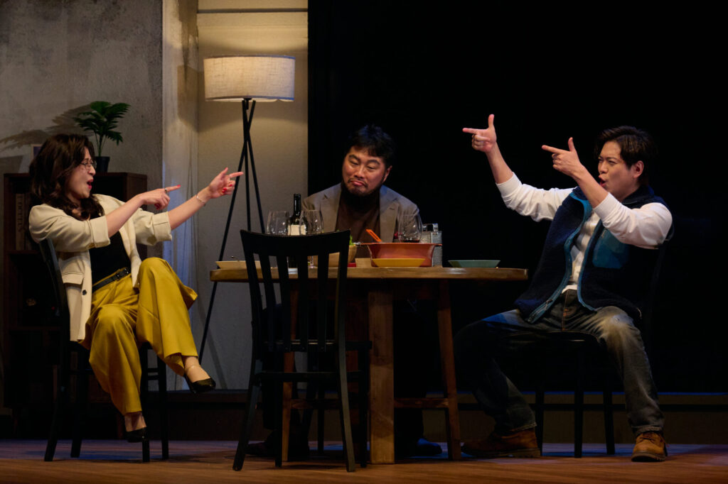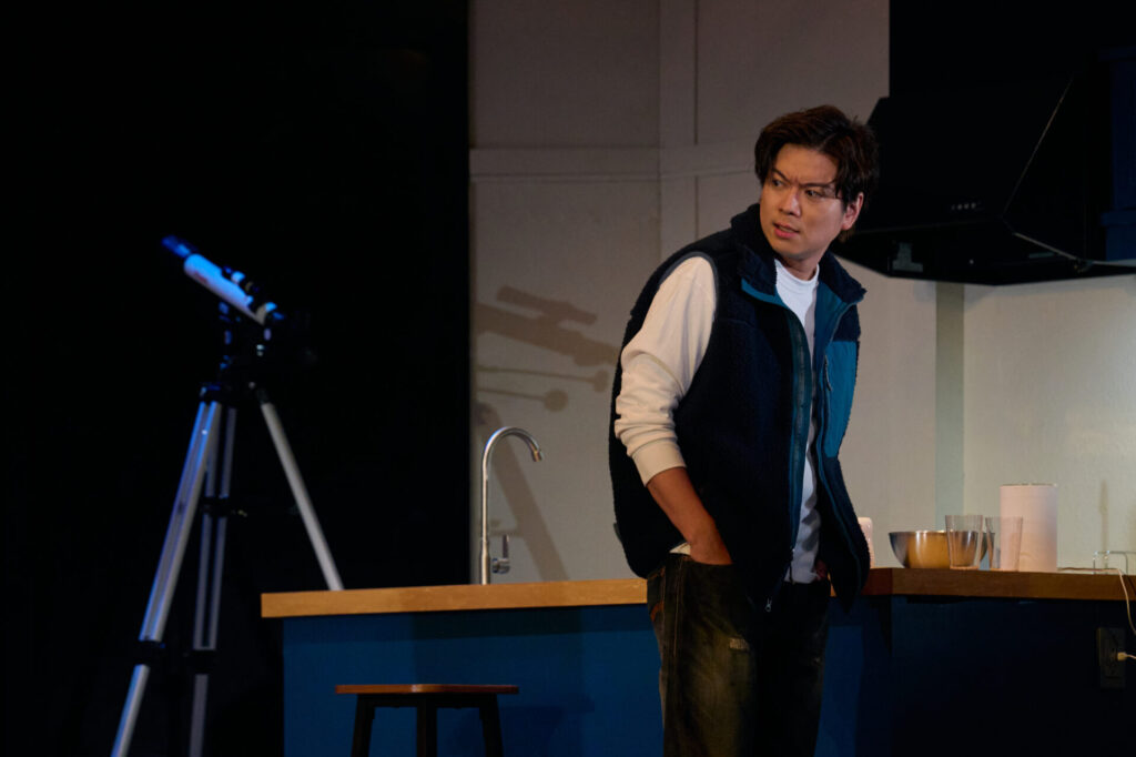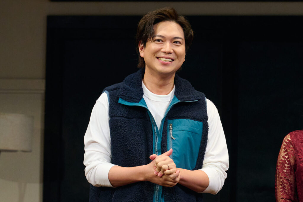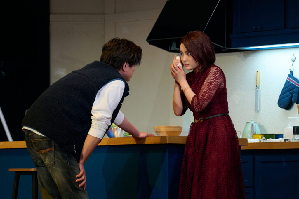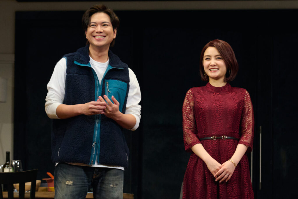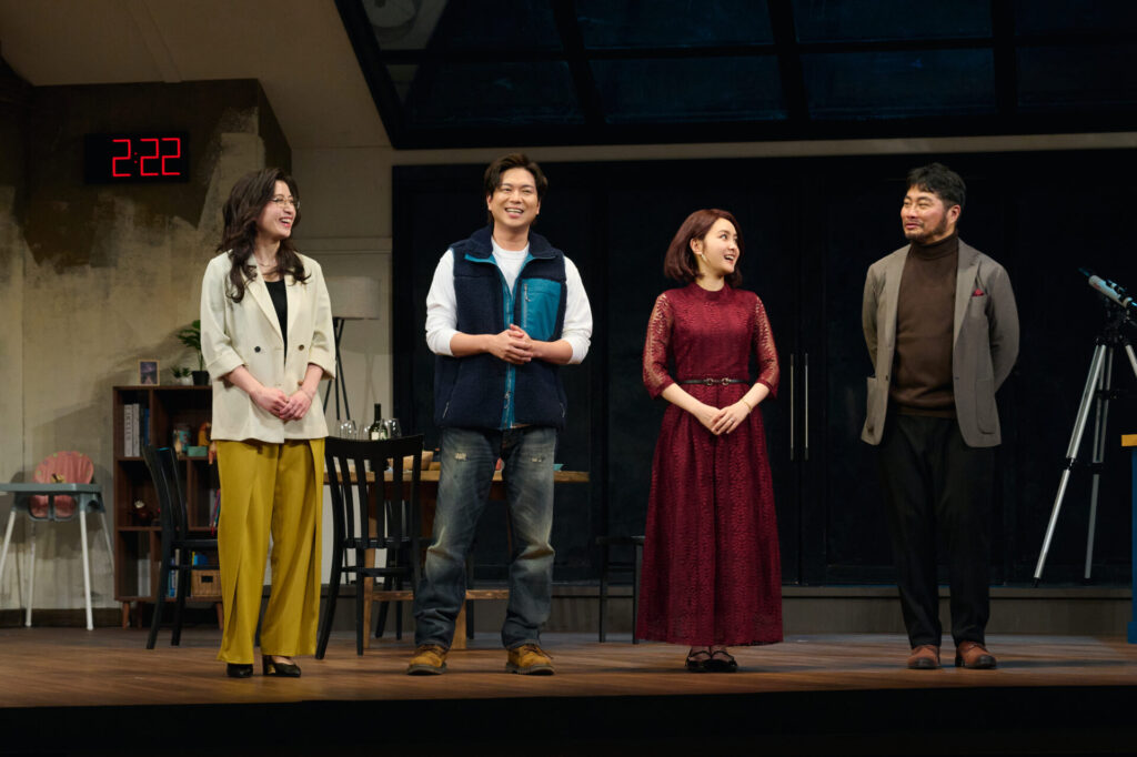 フォトコールでは1幕第2場から、約20分間のシーンが披露されました。物理学教授で文筆家のサム(加藤シゲアキさん)と、妻のジェニー(葵わかなさん)の自宅に、サムの旧友で心理セラピストのローレン(南沢奈央さん)と、ローレンのボーイフレンドで建築業者のベン(松尾諭さん)が訪ね、夕食を共にしています。