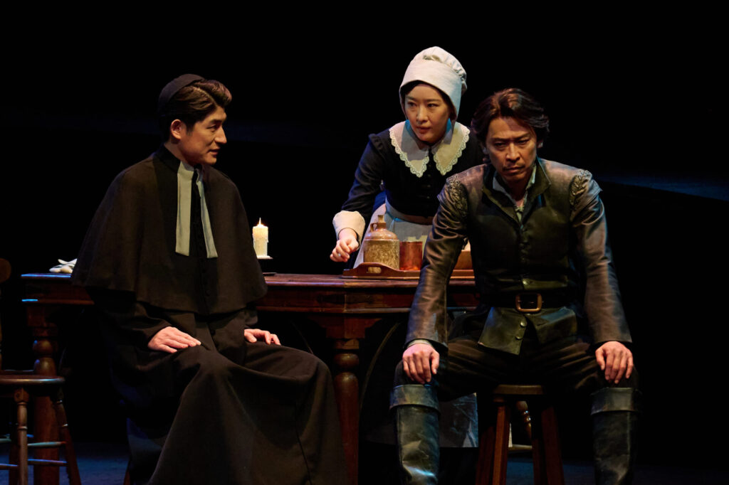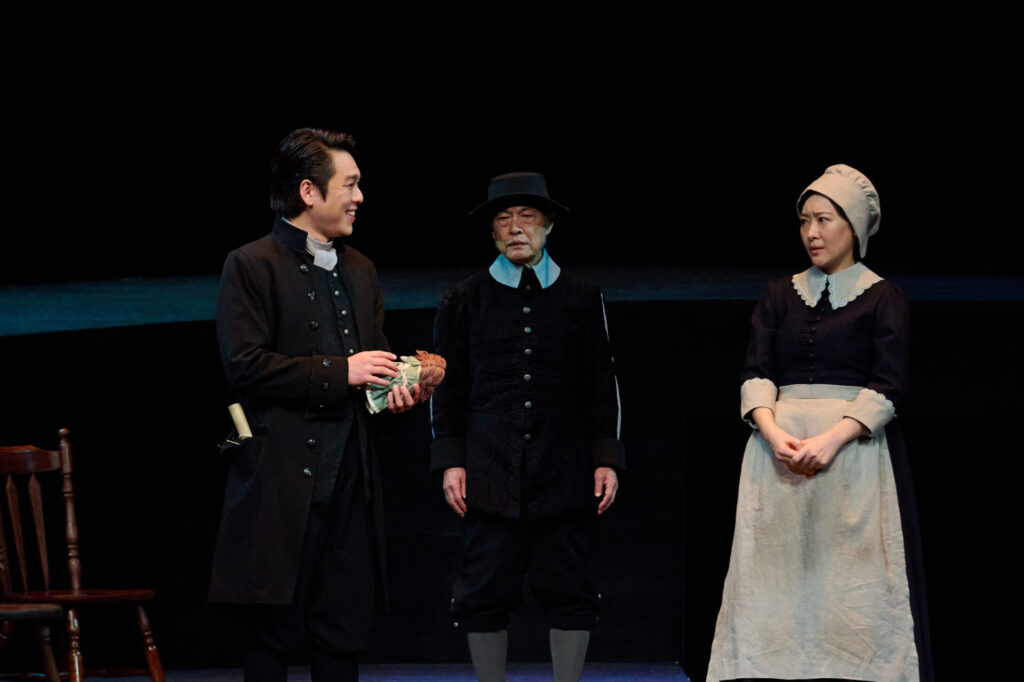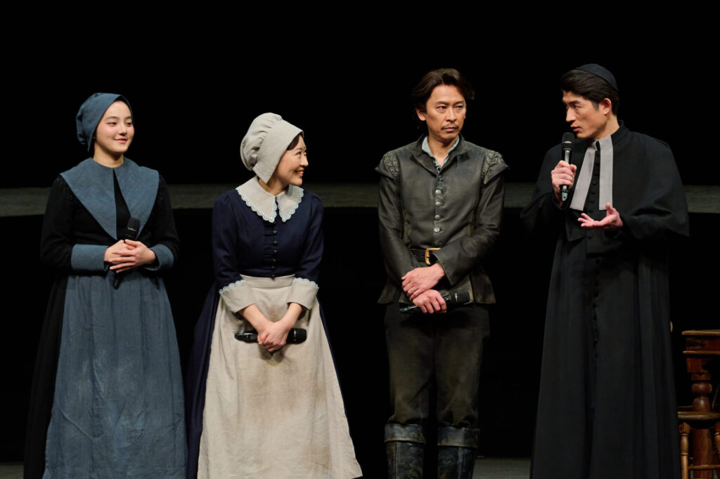 ジョン・ヘイル牧師役の松崎祐介さんは「これまでコメディ作品が多かったので、個人的に初めてのチャレンジになっています。悲劇で、実際に起きた事柄を物語で体現するということは、新たな引き出しが1個増えるんじゃないかと思います。この新しい気持ちをお客様にそのまま届けられたら」と意気込み、「上村さんは怖い方だという情報を色々なところから仕入れていたので、いざ本読みの時にお会いしたらなんてまろやかな方なんだろうと思いました。でも演劇に愛された方ですから、稽古場に入ると目の色が変わるんです。180度、僕たちの見えないところまで見る、僕には持っていない脳を持っている方」と語ります。