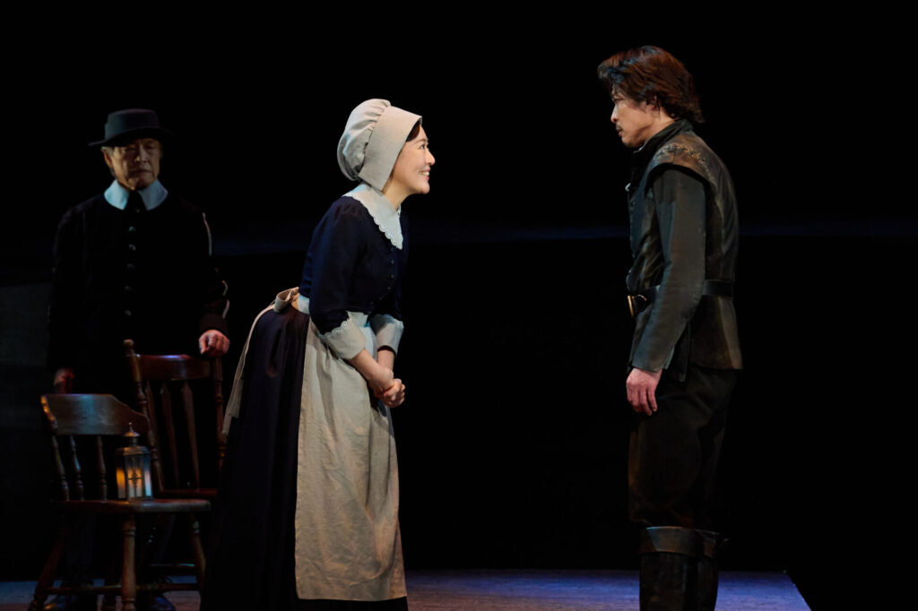 プレスコールでは2幕から約20分間のシーンが披露されました。円形舞台の中、坂本昌行さん演じるジョン・プロクターと、妻エリザベス(前田亜季さん)の元にヘイル牧師(松崎祐介さん)が現れます。少女アビゲイル(瀧 七海さん)によって村人たちが次々に“魔女”として告発されていく中、ついにエリザベスが告訴され−。