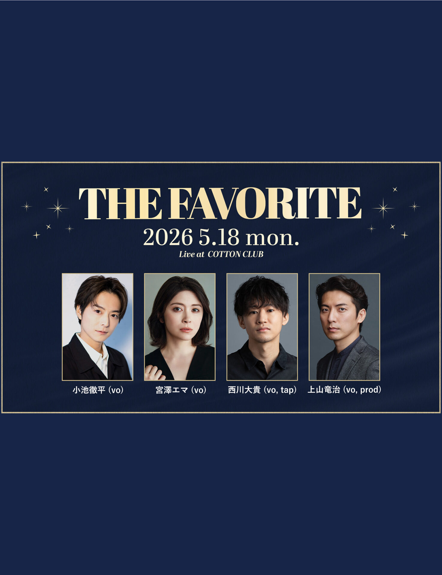 俳優の上山竜治さんがプロデュースする音楽イベント『THE FAVORITE』が、2026年5月に東京・COTTON CLUBで開催されます。ゲストに小池徹平さんと宮澤エマさん、西川大貴さんを迎えて贈る、特別なショーをお見逃しなく。