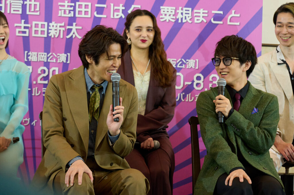民子と何やら関係がありそうな蒸気自転車屋の阿久沢正治を演じるのは、劇団イキウメに所属する浜田信也さん。「出身は東京なんですけれども、大学の4年間だけ大阪に行っていまして、そこで演劇をやり始めたんです。なので新感線はずっと身近に感じつつも、すごく遠くにいるでっかい背中という感じで演劇をやり続けていました。当時、大学の部室で安いお酒を飲みながら“いつか新感線とか出られたら良いよな”と話していたことを思い出し、ずいぶん時間が経ったんだなということと、その間も新感線が演劇界の先頭をずっと走り続けていたことに、考えられないくらいの労力があるだろうなと。歴史の中に飛び込んでいくチャレンジだと思って、毎日楽しく過ごしています」と思い入れが語られました。イキウメとはまた違った、歌って踊る浜田さんの姿に注目です。
