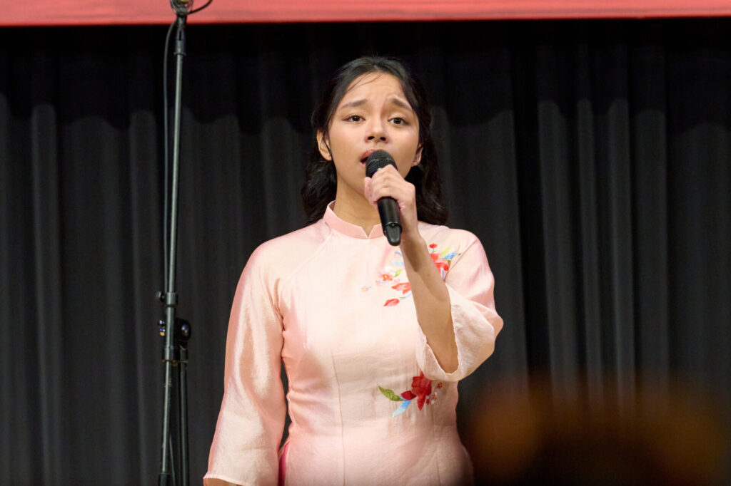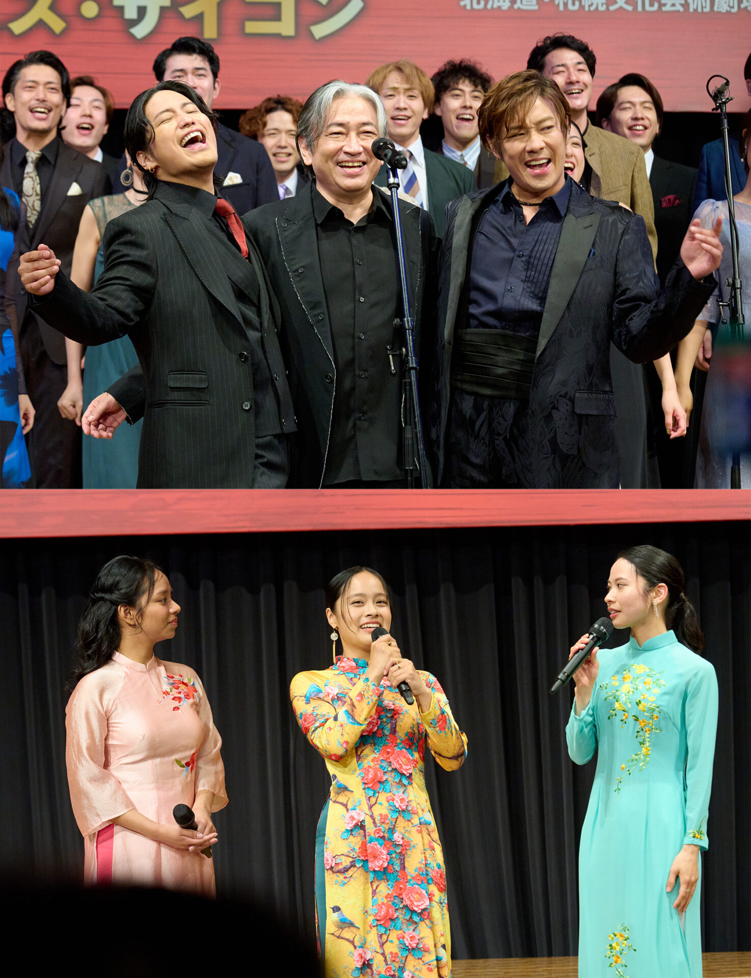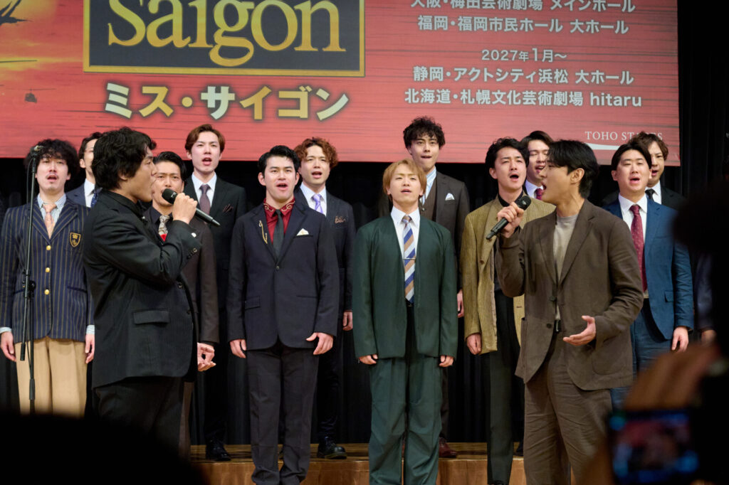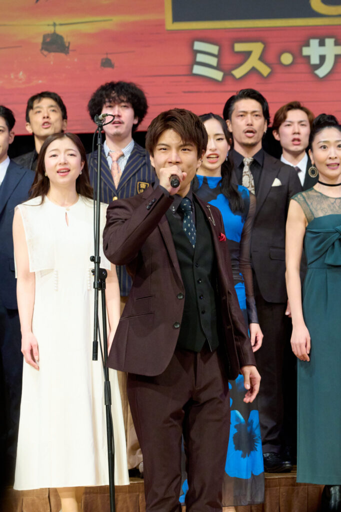 製作発表会見冒頭では、エンジニア役の駒田一さん・東山義久さん・桐山照史さん、キム役の屋比久知奈さん・清水美依紗さん・ルミーナさん、クリス役の甲斐翔真さん・小林唯さん、ジョン役のチェ・ウヒョクさん・金本泰潤さん、エレン役のエリアンナさん・加藤梨里香さん、トゥイ役の岡 シモンさん・吉田広大さん、ジジ役の則松亜海さん・藤森蓮華さん、さらにアンサンブルキャストも加わり、約30分間にわたる歌唱披露が行われました。